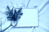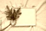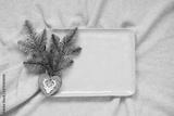 Flat lay overhead Christmas composition with serving tray on black background with fir tree brunch decor on grey cozy plaid