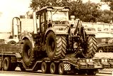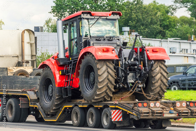Powerful red tractor on a platform trailer road transportation.