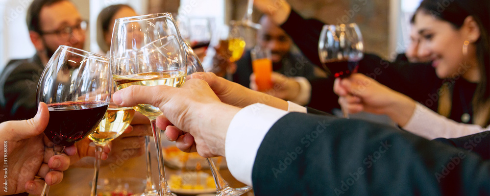 Corporate. Hands of friends, colleagues during beer drinking, having fun, clinking bottles, glasses together. Flyer with copyspace. Oktoberfest, friendship, togetherness, happiness holidays concept