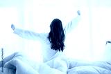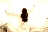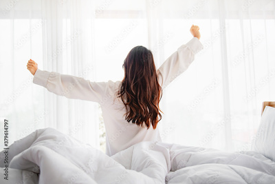 Happy woman stretching in bed after waking up. Happy young girl greets good day.