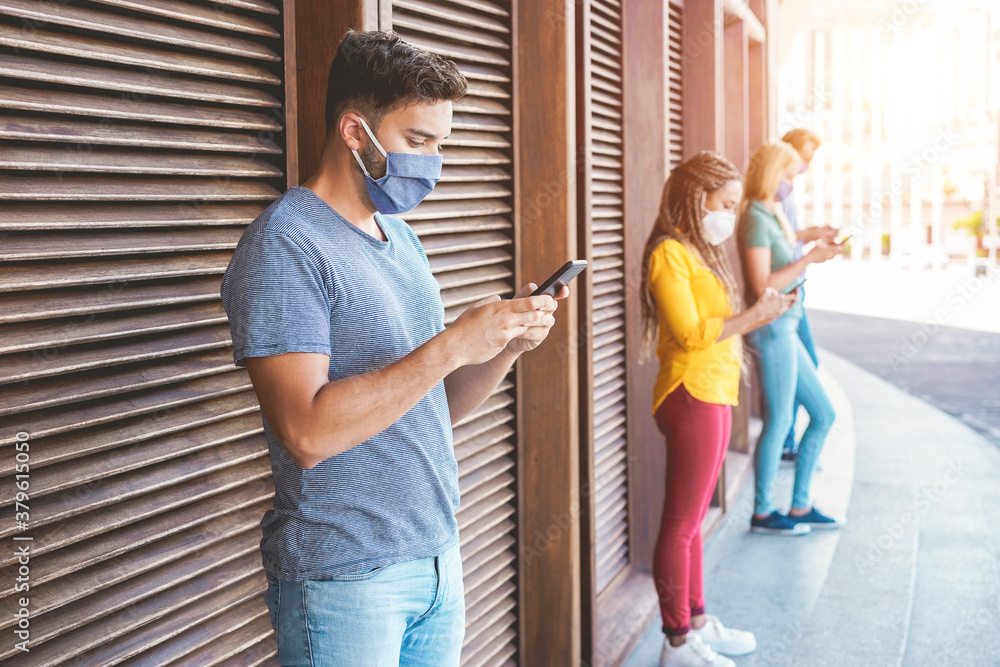 Young people wearing face safety masks using smart mobile phones while keeping social distance during coronavirus time - Technology and covid-19 spread prevention concept - Focus on man hands