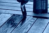 Male hand paints wood oil on thermo-ash with a broad brush, the paint bucket is in the background