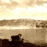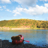 Orange packraft rubber boat with backpack on a river. Packrafting. Active lifestile concept