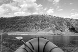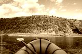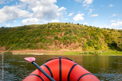 Orange packraft rubber boat on a river. Packrafting. Active lifestile concept