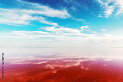 Pink lake water under blue sky with fluffy clouds in summer day. Creative color concept