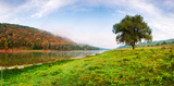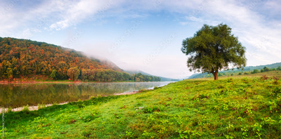 Majestic foggy river and lush autumn forest at sunrise time. Landscape photography. Dnister, Ukraine, Europe