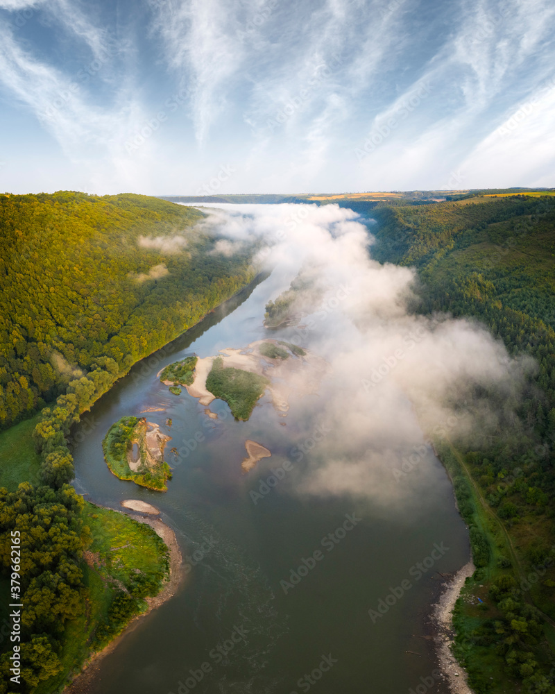 Flight through majestic foggy river and lush green forest at sunrise time. Landscape photography. Dnister, Ukraine, Europe