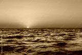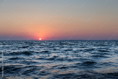 Sunset in the ocean with large sun dusk soft waves and red cloudy sky. Sea sunrise background. Landscape photography