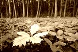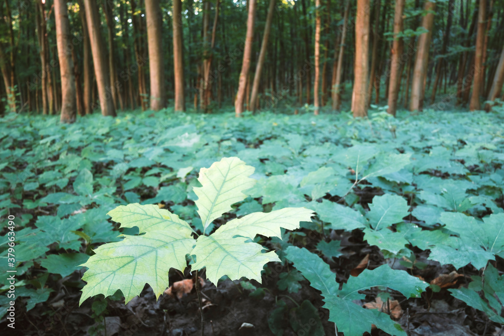 Young oak stree seedlings in oak forest. Nature woods and trees background
