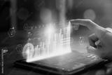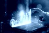 Stock exchange market concept, businesswoman hand trader press digital tablet with graphs analysis candle line on table in office, diagrams on screen.