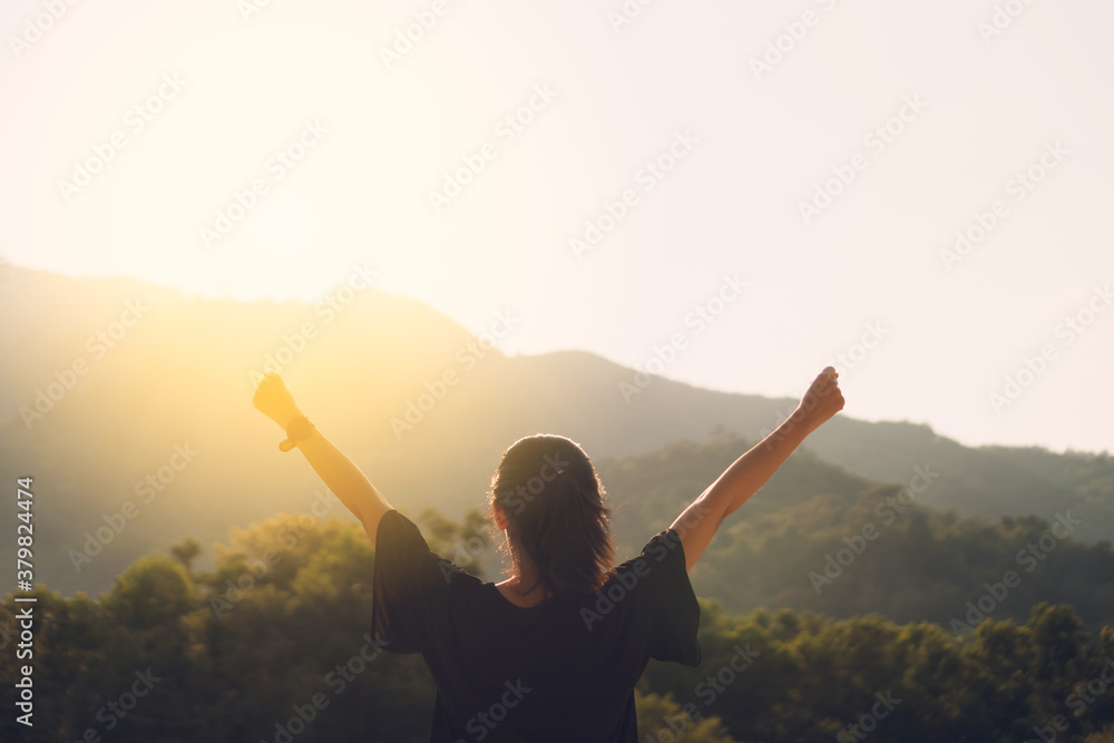 Copy space of woman rise hand up on top of mountain and sunset sky abstract background.