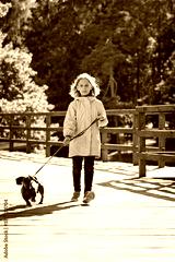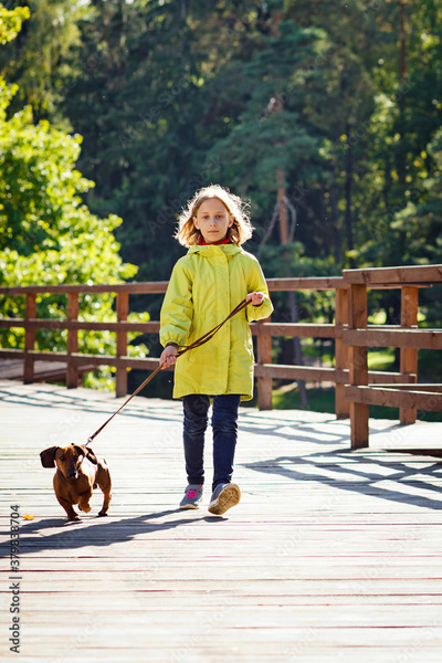 A girl walks her dog in the Park. A child and a red Dachshund on a leash walk across the bridge in autumn in Sunny weather.