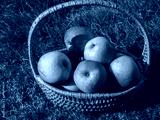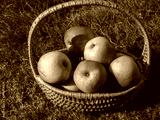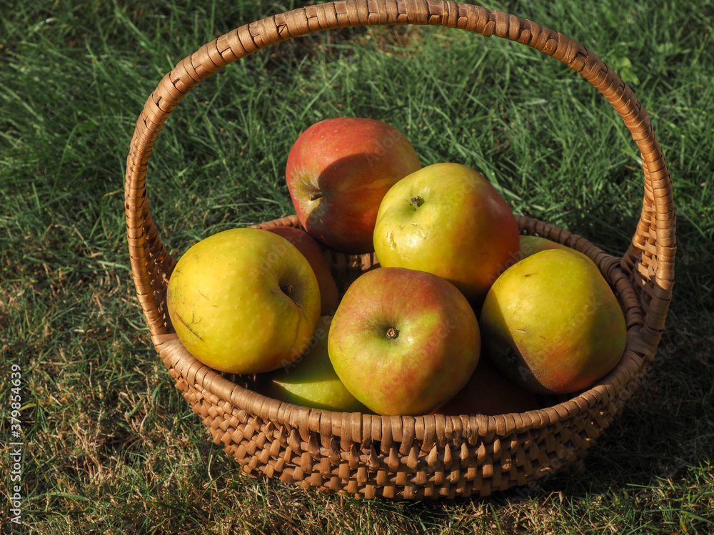 Rustic organic apples in a wicker basket on a meadow orchard,