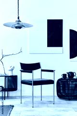 Interior design of modern living room with black stylish commode, chair, mock up art paintings, lamp, pouf, decorations and elegant accessories in home decor. Template.