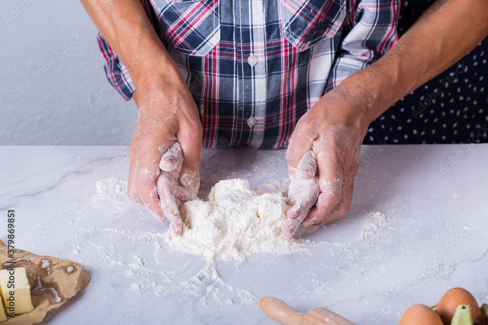 Grandmother with grandson cooking, kneading dough, baking in the kitchen