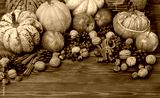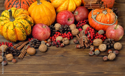 pumpkins, cones, nuts, berries, apples on wooden table. autumn time, thanksgiving concept.