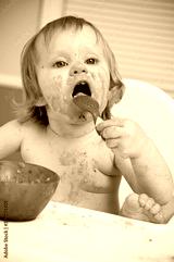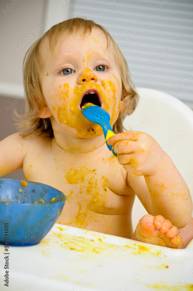 Cute Messy Baby Covered in Food, Eating in Highchair at Home