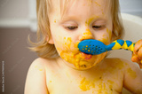 Cute Messy Baby Covered in Food, Eating in Highchair at Home