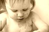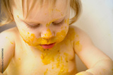 Cute Messy Baby Covered in Food, Eating in Highchair at Home