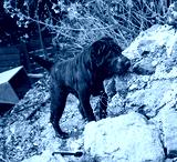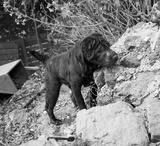 Closeup of an adorable black Shar-Pei climbing rocks outdoors during daylight