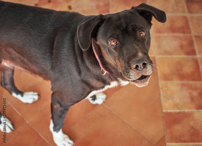 High angle shot of an adorable labrador retriever indoors