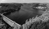 Aerial view of a huge lake surrounded by rural farmland and forest. (Lake Vyrnwy, Wales)