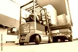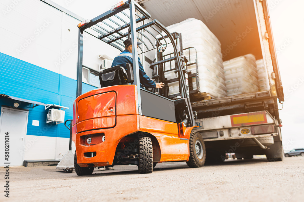 A man on a forklift works in a large warehouse, unloads bags of raw materials