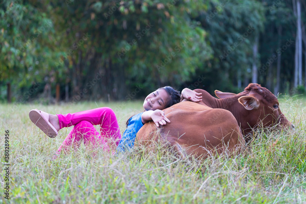 A young Asian girl is lounging in the pasture with her cow in a ranch. The concept of animal love.