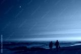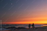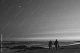 Silhouette of a surfers walking on the beach at sunset, with waves crashing in the background. Long Beach New York