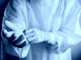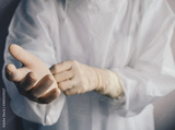 Healthcare worker wearing safety glove and PPE suit for working in hospital during Covid-19 pandemic.