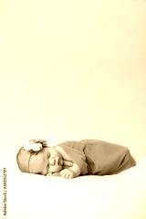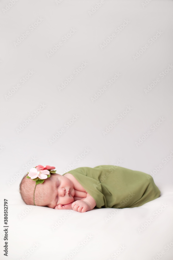 Newborn Baby Girl Sleeping Peacefully in Green Blanket, Wearing Flower Headband, Spring, Room for Text