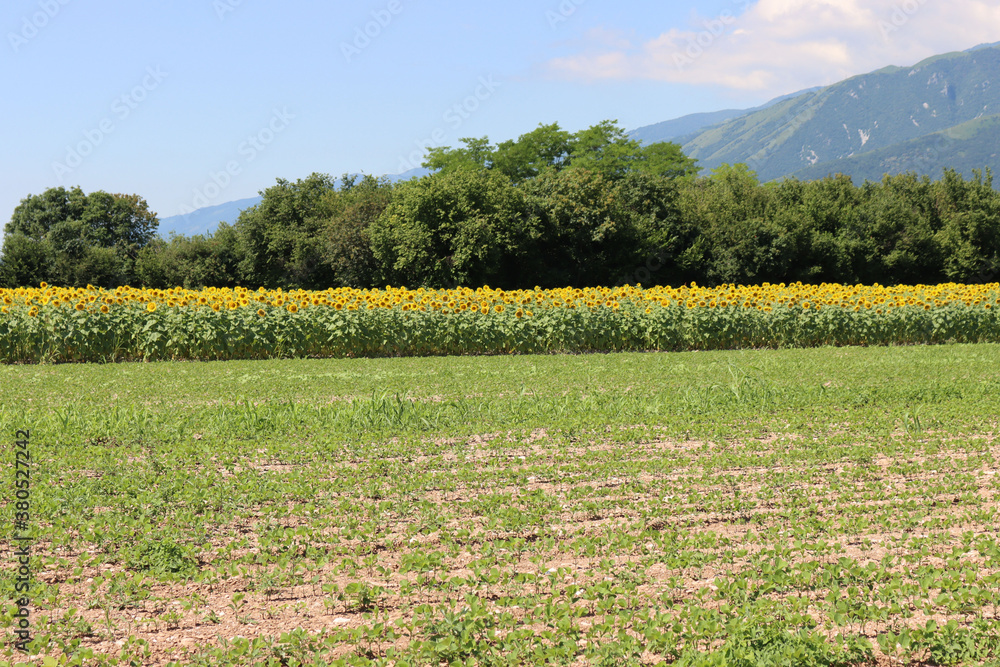 Sunflowers in bloom i the italian countryside on a sunny day. Helianthus annuus cultivation