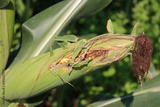 Damaged ear of corn in field. Zea mays or maize ear damaged by bird feeding