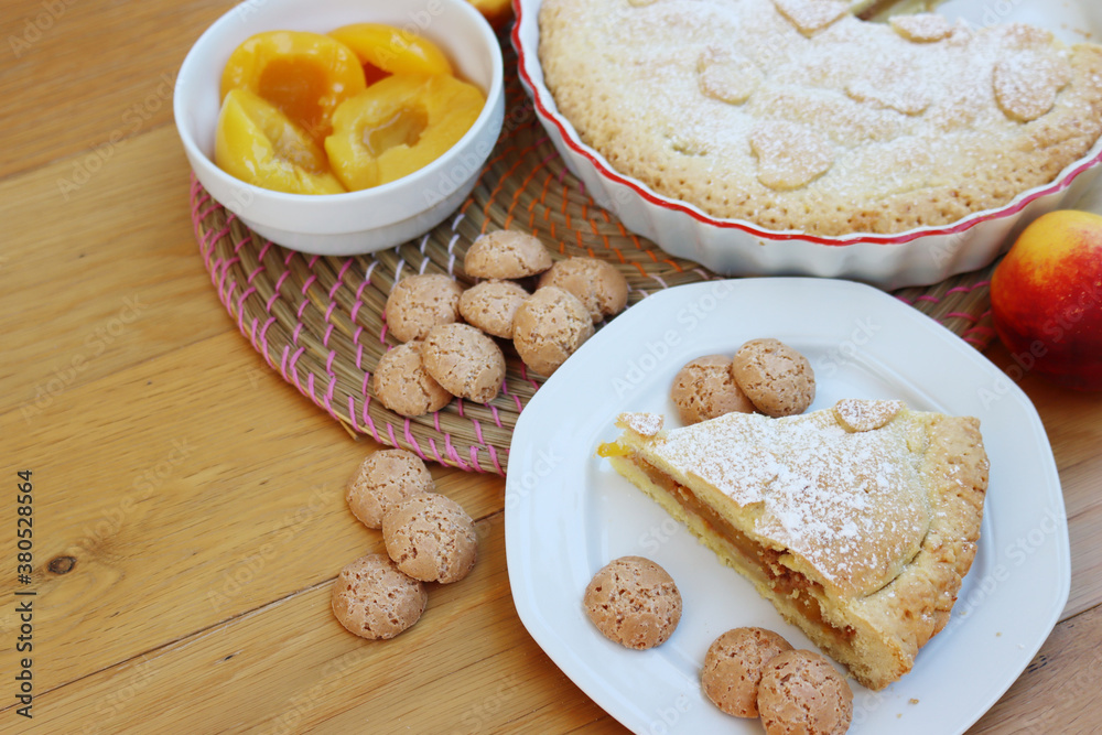 Sweet cake with canned peaches on syrup and italian Amaretti cookies on wooden table