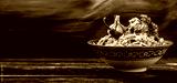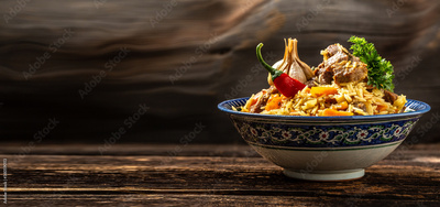Traditional uzbek meal called pilaf. Rice with meat on plate with oriental ornament on a dark wooden background, Long banner format. space for text