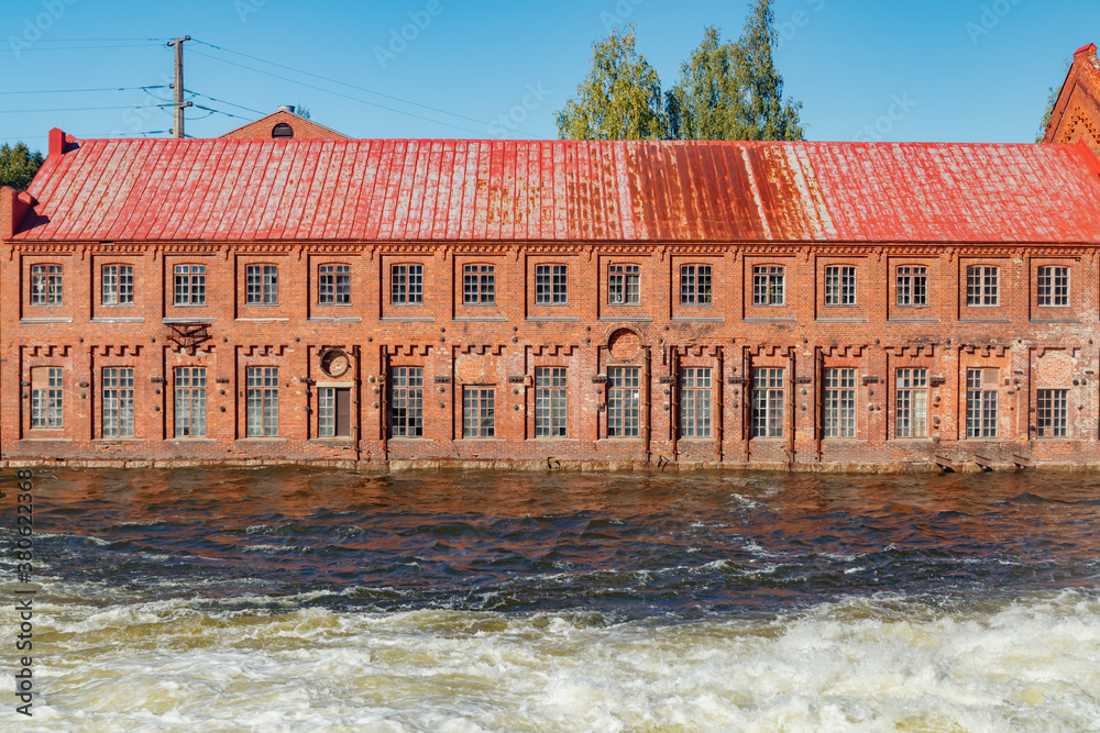 Kouvola, Finland - 15 September 2020: Old red brick buildings of Upm factory on rapids Kuusankoski.