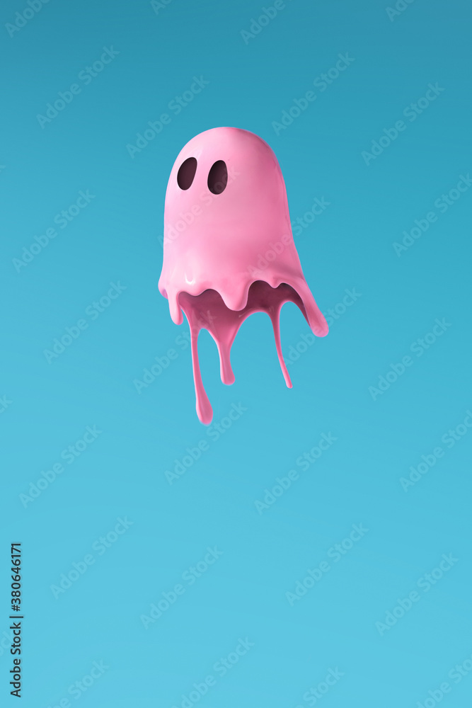 Pink Halloween ghost made out of paint. Minimal holiday fun spooky concept. Autumn season background.