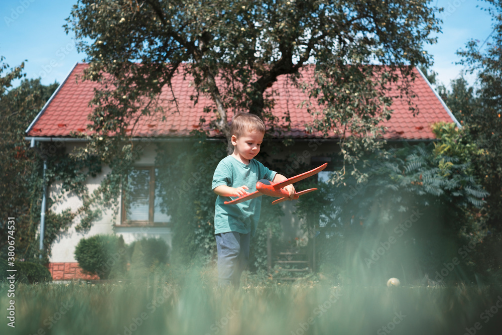 Happy kid playing with red airplane on lawn near his home