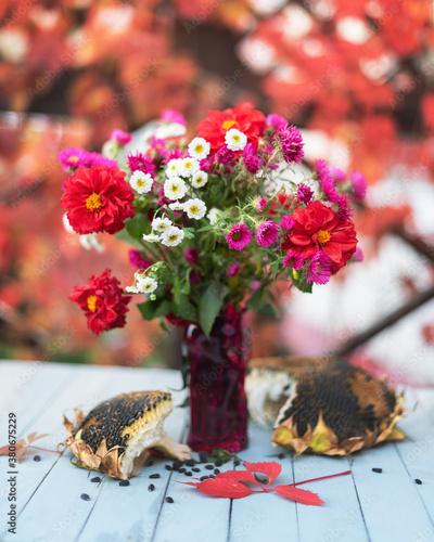 Bouquet of red and white autumn flowers in glass vase on wooden table