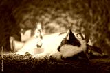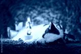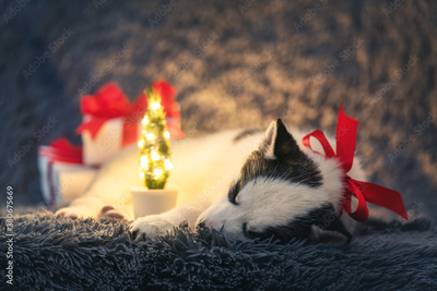 A small white dog puppy breed siberian husky with red bow and gift boxes sleep on grey carpet. Perfect birthday and Christmas present for your child