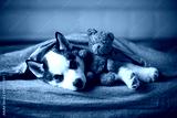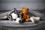 A small white dog puppy breed siberian husky with beautiful blue eyes lays on grey carpet with bear toy. Dogs and pet photography