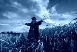 Scary scarecrow in a hat on a cornfield in orange sunset background. Halloween holiday concept