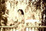 Outdoor portrait of pretty woman in warm golden light, young female model enjoying nice day in sunny park