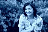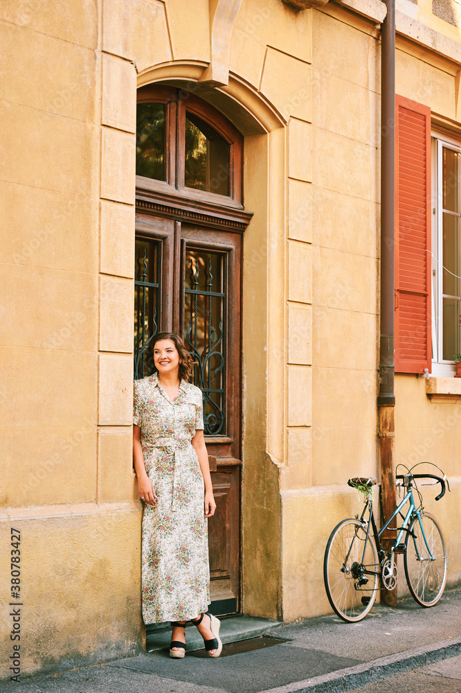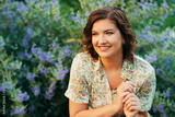 Sunny portrait of happy young woman posing in beautiful garden with purple flowers