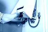 Plumber attaches Trying To Fix the Problem with the Residential Heating Equipment. Repair of a gas boiler