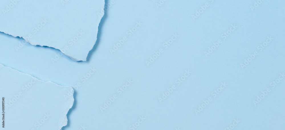 Abstract monochrome background. Pieces of torn paper on light blue background. Top view