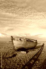 Wreckage of an old boat on the beach at Dungeness in Kent