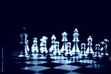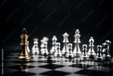 King golden chess standing confront of the silver chess team to challenge concepts of leadership and business strategy and rick management.