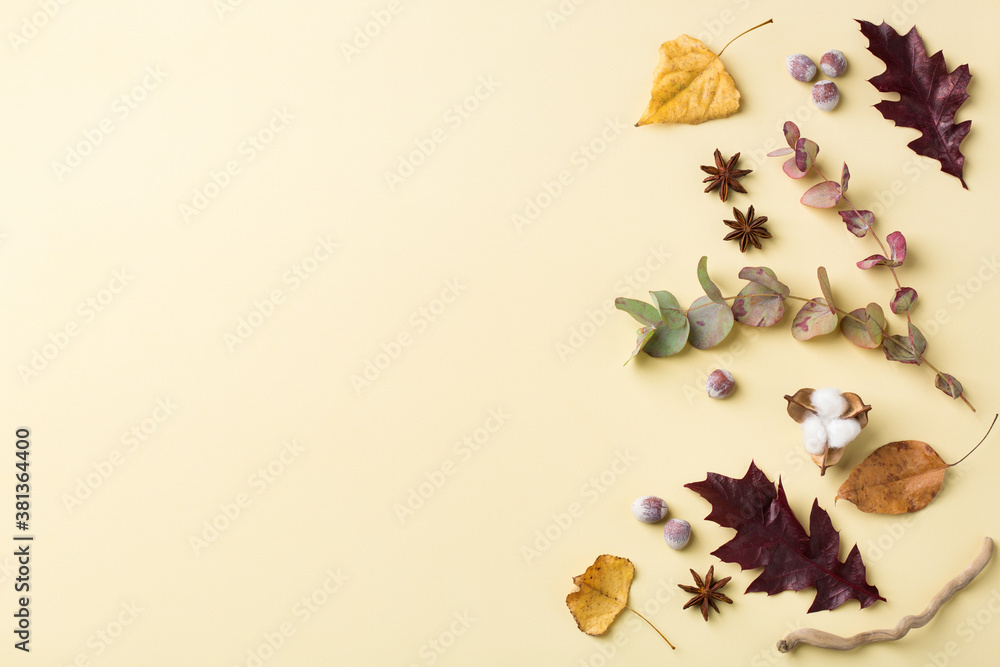 Autumn fall thanksgiving day floral composition with dried leaves