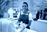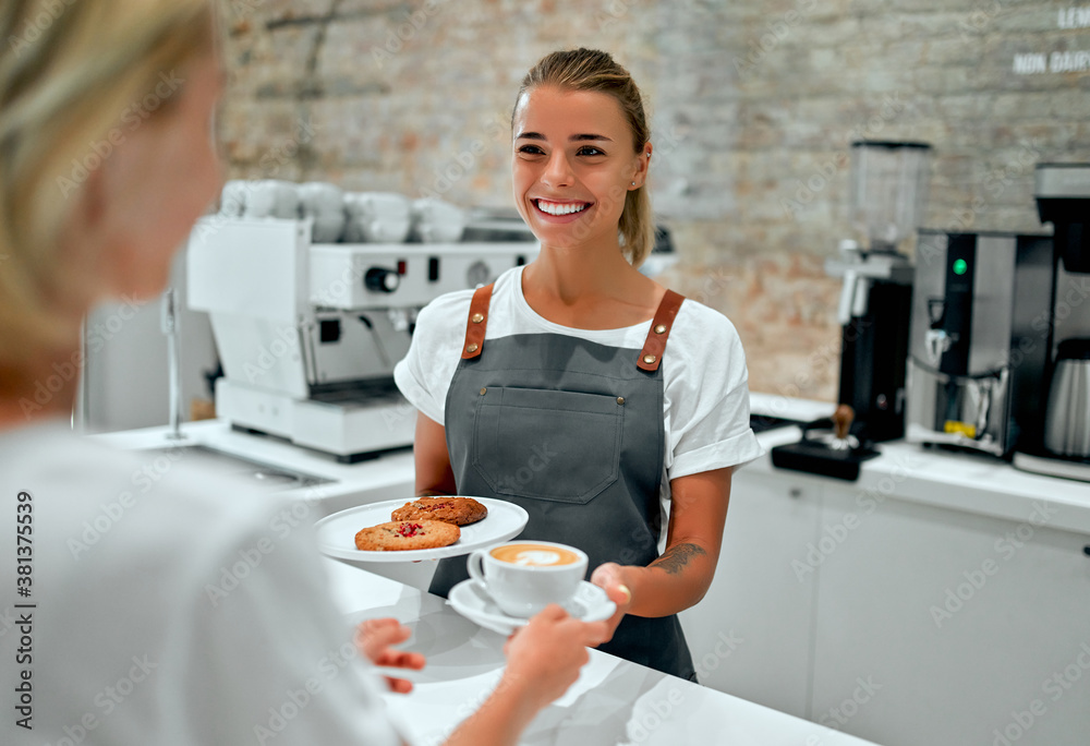 Beautiful female barista giving a cup of coffee or cappuccino and a plate of cookies to a customer in a coffee shop.